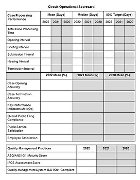 Developed in 2023 as part of a fellowship with the National Center for State Court’s Institute for Court Management (read the research), the Appellate Circuit Operations Scorecard allows federal appellate courts to report macro-level data about their operations on an annual basis. The reported data considers processing times at different variables across the life of an appellate case, key front-line operational performance indicators, and the court’s use of third-party quality management standards to enhance operations. Data from the Scorecard can be used for benchmarking the court’s performance against sister courts and to promote public trust and confidence through the transparent reporting of this information, such as in the court’s annual report. A blank scorecard is available for download.